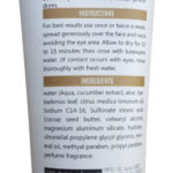 Directions: For best results use once or twice a week. Spread generously over the face and neck avoiding the eye area. Allow to dry for 10 to 15 minutes then rinse with lukewarm water. (If contact occurs with eyes, rinse thoroughly with fresh water.