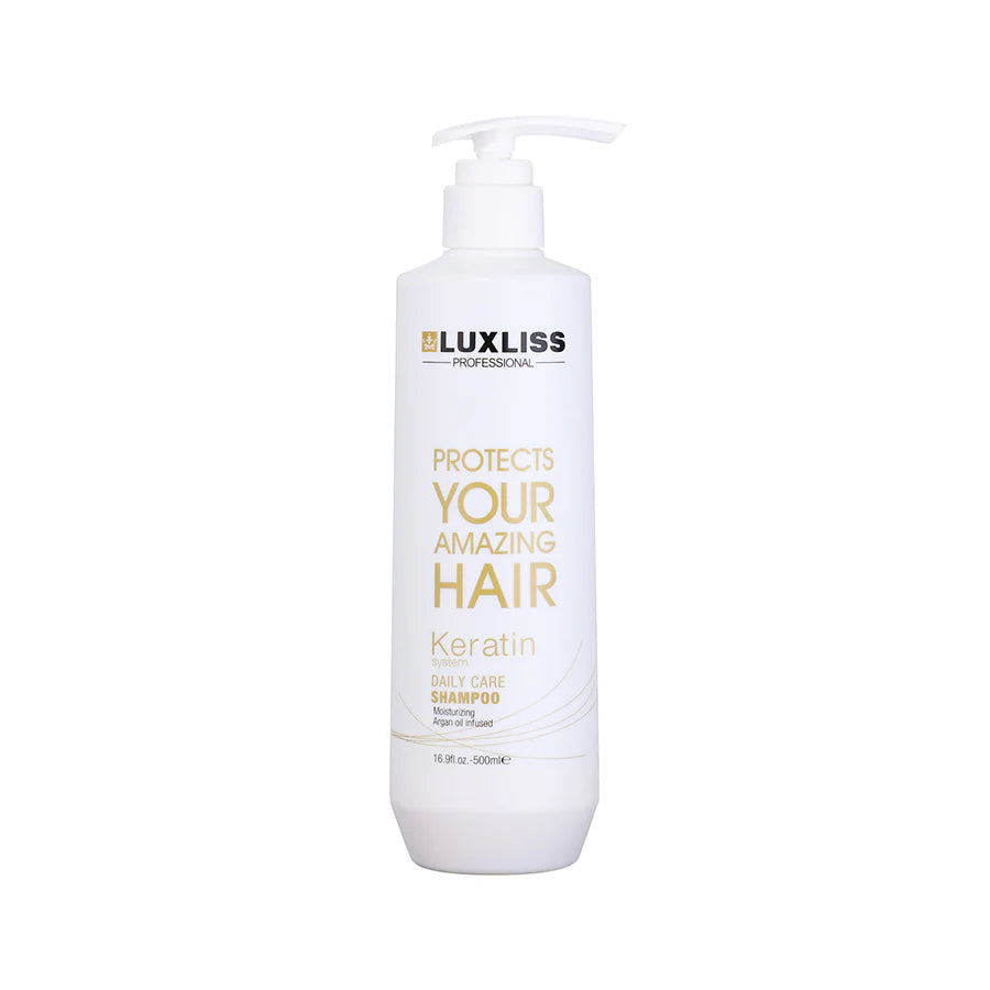 DIRECTIONS Apply onto wet hair and scalp. Massage into lather and rinse thoroughly, repeat if necessary. Then use LUXLISS KERATIN DAILY CARE CONDITIONER ANTI-FRIZZ LEAVES HAIR SHINE & SMOOTH NO BUILDING UP CONTAIN ARGAN OIL
