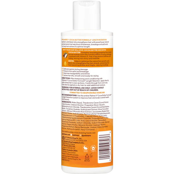 Palmer’s Cocoa Butter Formula® Length Retention system with Biotin, fully strengthens hair with powerhouse natural protectants that help block fragileness, brittleness, breakage and split ends, to help hair achieve its optimal length.